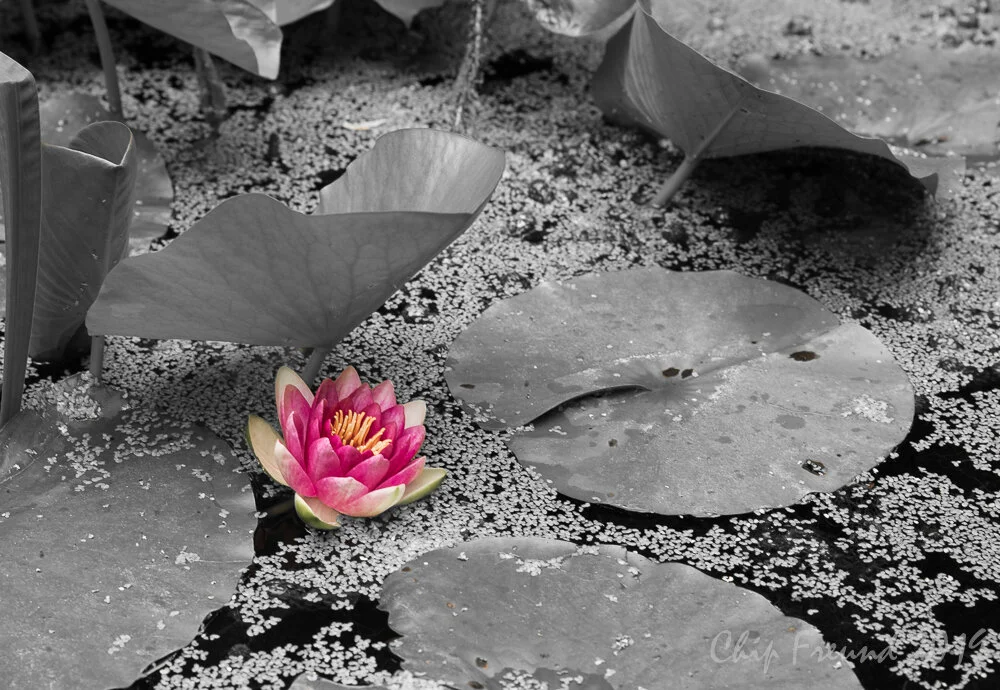 The striking pinks and yellow of this water lily bloom are unaltered. Taking the rest of the image to black and white, makes the color of the flower “pop”. This image is available as limited-edition fine art print, matted or framed, as well as a gallery wrap canvas, as seen above.